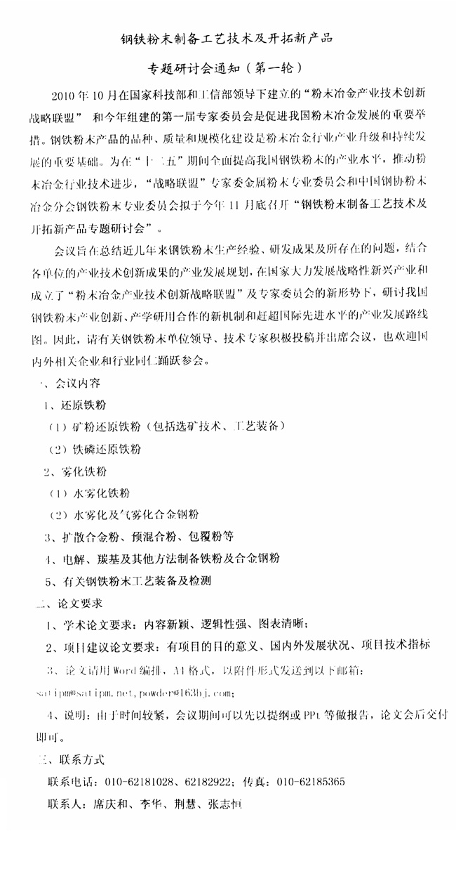 钢铁粉末制备工艺技术及开拓新产品专题研讨会通知(第一轮)